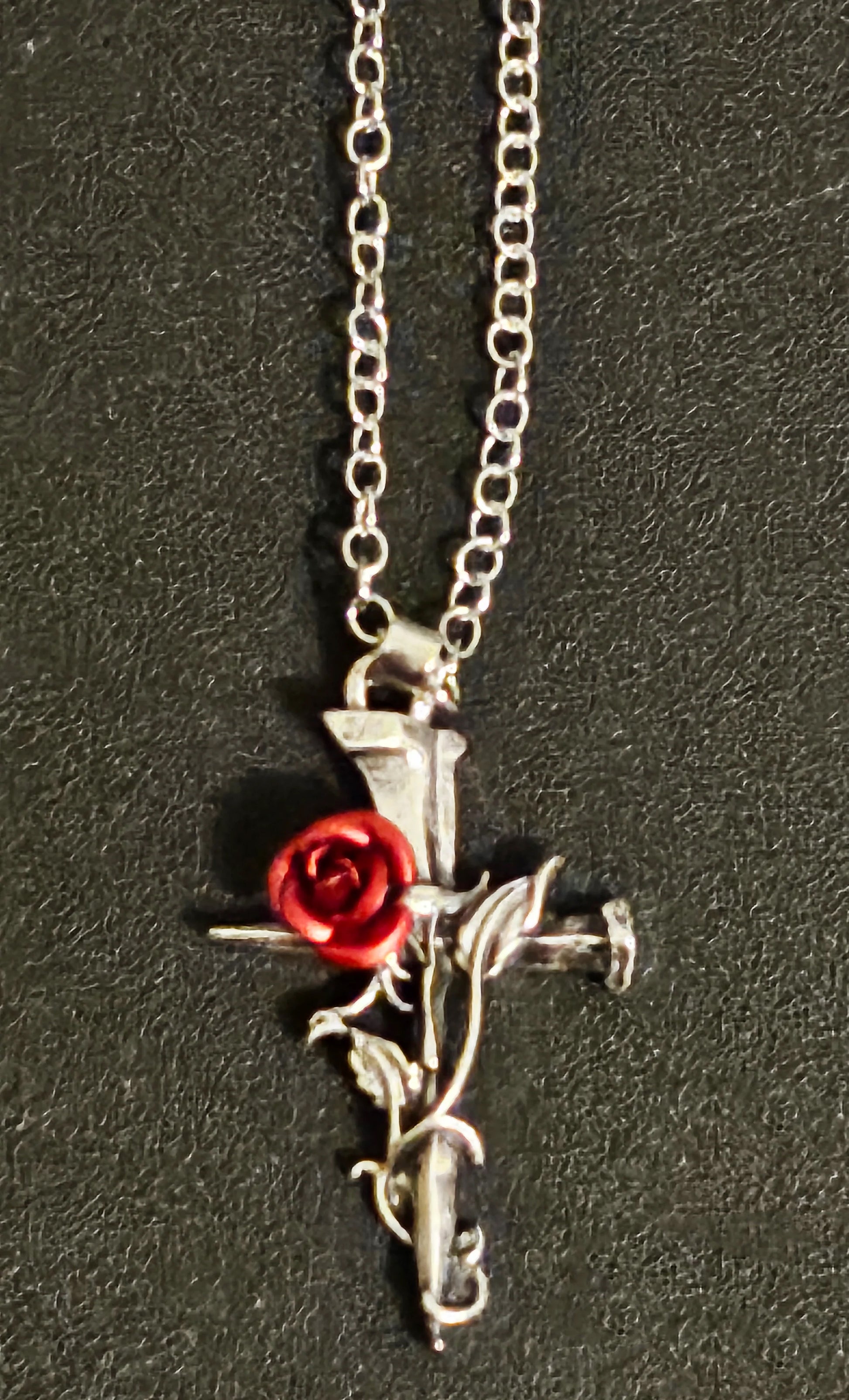 This Cross of Nails is employed as a symbol of hope and peace in the aftermath of the crucifixion of Jesus Christ. Featuring a symbolic Rose in the center. This cross measures about 1" x 1" and the chain is 22".